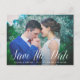 An elegant wedding save the date postcard designed to accommodate your favourite horizontal or landscape orientated full-bleed engagement photo. "Save the date" appears as a white text overlay in hand lettered calligraphy script. Personalise with your names, wedding date and wedding location beneath.