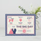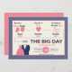 Timeline Of Love Save The Date Card. Share your love story and the sweet moments leading up to your wedding day with this fun save the date. Inspired by a timeline of events, this design includes cute and whimsical graphics to go with each of your milestones including the day you met, fell in love, and got engaged. At the end of the timeline, an arrow points to the phrase "the big day" which accents your wedding date. A border of diagonal stripes in bold colours frames all of the important details and there are pink and white polka dots on the back side.