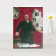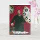 A photograph of a collaged image by Artyfax. A Victorian businessman stands wonderingly amongst a broken clock face. Is he trying to stop time? The background is red The text inside the card is customisable to enable your own personal message