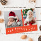 Minimal and modern holiday theme birth announcement photo template card featuring 2 photos of your newborn on the front with a fun typography text that says "the tiniest noel." You can also add another picture and message on the back. The background is retro red.