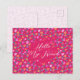Hand-drawn floral postcard with custom text on the front. Say hello to a friend, with a pretty postcard design. Colorful, tiny flowers on cheerful pink and the design carries to the back of the card. Sample text on the front is, "Hello my friend". Customize it to any greeting.
