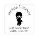 Cute cartoon ninja girl is dressed all in black but for a small bow on top of her head mask. Traditional Japanese sword katana can be seen attached over her shoulder.