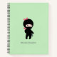 Cute cartoon ninja girl is dressed all in black but for a pink bow on top of her head mask. Traditional Japanese sword katana can be seen attached over her shoulder, it’s handle also coloured pink.