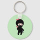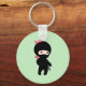 Cute cartoon ninja girl is dressed all in black but for a pink bow on top of her head mask. Traditional Japanese sword katana can be seen attached over her shoulder, it’s handle also coloured pink.