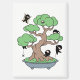 Simple illustration of a Japanese potted bonsai tree in a shallow tray. A group of tiny ninjas made this tree their base. Several ninjas are hiding behind the foliage. One is dangling from a rope tied to a branch, another hovers above the tree strapped to a kite.