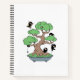Simple illustration of a Japanese potted bonsai tree in a shallow tray. A group of tiny ninjas made this tree their base. Several ninjas are hiding behind the foliage. One is dangling from a rope tied to a branch, another hovers above the tree strapped to a kite.