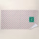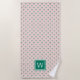 Preppy chic monogrammed beach towel in pale blush pink and green features an allover pattern of palm trees, with your single initial monogram centred at the bottom in vibrant emerald green.