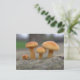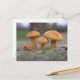 This cute postcard features a beautifully detailed photograph of 4 small yellow toadstools emerging from a log in a park. The background is blurred and the fungi are photographed level so you see the world from their perspective.