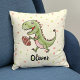 This personalised throw pillow features a cute, whimsical T-Rex sporting a football with small hearts in the background. It is perfect for little football fans. Customise it with your baby's name for a unique touch.