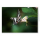 A photograph of a Zebra Swallowtail feeding at a cluster of flowers in a garden.