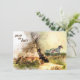 This Save the Date wedding announcements features a beautiful watercolor tribal tipi and colourful Indian horse set against a scenic background. On the back above the text, there is a boho arrow with hearts and vines.