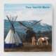 A scene from the Pacific Northwest region of the United States featuring an image of a Native American and his horse near a tipi. Snow has settled on the higher slopes of the mountains in the background. Add your own text.