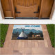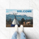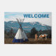 A scene from the Pacific Northwest region of the United States featuring an image of a Native American and his horse near a tipi. Snow has settled on the higher slopes of the mountains in the background. Customisable text reading, "WELCOME" also appears.