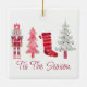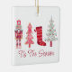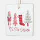 A "Tis the season" saying Christmas tree ornament with beloved symbols of the Christmas holidays in pink and red watercolors. Christmas tree, Christmas cookie, nutcracker toy soldier, Christmas stocking. A few of your favourite things.