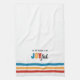 Joyful kitchen towel to brighten your kitchen throughout the holiday season. "Tis the Season to be Joyful. White towel with turquoise, red, and yellow stripes.