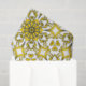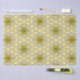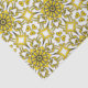 Intricate arabesque pattern featuring symmetrical floral motifs in black, white, and yellow. Each motif consists of a central flower surrounded by petal-like shapes, forming a circular arrangement. Heart-shaped elements fill the spaces between motifs. The design is on a white background, creating a striking contrast with the detailed linework. This style is reminiscent of traditional Middle Eastern ornamental art, emphasizing symmetry and repetition.