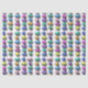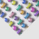 3D buttons, in rectangles and circles, are shown in multiple pastel colours. Design replicated multiple times on a diagonal, across the surface. Yellow, orange, pink, magenta, turquoise, blue, purple