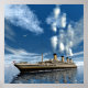 Famous Titanic ship floating among icebergs on the water by cloudy day - 3D render