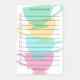 Personalised post-it notes in with a practical to do list featuring check-boxes to easily see which tasks or chores you've completed. At the bottom, a satisfying all done! in a pretty script. Customise by adding your name. The background of the to do list post-its features a stack of four teacups in green, yellow, blue, and pink.