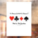 Showcase your wry bridge / duplicate bridge attitude with this window cling featuring the four card suits along with the following rhetorical question often noted by a declarer -- inside her or his mind when playing bridge: "To Finesse Or Not To Finesse? That Is The Question". With apologies to William Shakespeare! Memorable bridge saying window cling for any avid bridge player when trying to decide what card to play next!