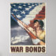Vintage World War II war bond poster showing a soldier waving an American Flag.