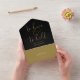 This all-in-one minimalist wedding invitation features elegant gold typography on a black background. The invitation includes a perforated RSVP card that can be individually addressed or left blank so you can handwrite your guest's address details. Designed by Thisisnotme©