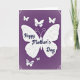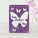 This card features a deep purple background with a softly textured, fabric-like look that feels cozy and intimate ❤️. At the center, a large white butterfly spreads wide wings decorated with faint curling patterns, like delicate lace. Across the butterfly’s body, the text “Happy Mother’s Day” appears in flowing white lettering, stretching neatly from left wing to right wing. Several smaller white butterflies flutter nearby, arranged so they seem to circle the main one like close companions. One small butterfly includes the word “SISTER” in white lettering, and another lower butterfly reads “To My SISTER,” suggesting a caring, sisterly bond in the way they hover close together. Gentle floral corner details in pale white peek from the top and bottom edges, adding a soft garden touch 🌼. The upper corners show fine, lace-like blossoms and curling leaves against the purple field.