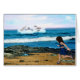 A digital painting of a young girl running along the shore, going to see the dolphins playing out at sea.