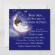 Sweet baby moon and stars we love you to the moon and back baby boy shower invitations. This elegant night time moon and stars baby boy shower invitation is easily customised for your event. You can add your event details in the font style and wording of your choice, as well as change the background colour to whatever you prefer.