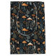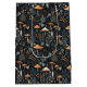 This whimsical design features terracotta toadstool mushrooms on a dark navy blue background with forest berries and fauna.
