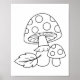 Cute cartoon illustration of toadstool red-capped mushrooms and a dry leaf. Made for easy colouring.