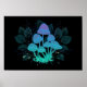 Mysterious, bioluminescent, hallucinogenic, bright toadstools with bushes of marsh plants on night, dark, glowing background. Glowing mushrooms. Goblincore, Mushroomcore,