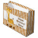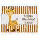 Toasted orange and white stripe background. Large white band in middle. Long necked, baby giraffe on band with customisable text. Template is at right for your convenience. Safari Giraffe graphic Credit Prettygrafik.com.