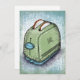 Toaster in green and blue with 2 slices of white bread peeking out of the holes. This small kitchen appliance sits on a blue and green distressed striped background.