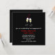 Stylish engagement party invitation done in a square shape, with a jet black background and cartoon graphics of two toasting champagne glasses, with hearts bubbling up. Text in modern white and red is ready to personalise for your party. Fun invitation any couple would love.