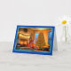 Beside the tree, a warm fireplace is decorated with a lush garland of green pine branches and multi-coloured lights, and a holiday wreath hangs above. The soft glow from the fire and lights fills the room with warmth, creating an inviting atmosphere. The greeting "Merry Christmas" is written in elegant blue script at the bottom, framed by a modern blue border that adds a touch of vibrancy to the card. This card is perfect for anyone who loves traditional holiday decor and the cosy spirit of Christmas.