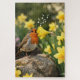 A robin sits on a rock surrounded by vibrant yellow daffodils, playfully singing into one as if it were a microphone, illustrated by whimsical musical notes