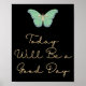 This poster has the inspirational message of, "Today will be a Good Day." This message is set on a black background with a large green butterfly with blue and orange accents centered at the top of the poster.