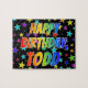This exciting and fun birthday-themed jigsaw puzzle design has the message "HAPPY BIRTHDAY, TODD" with the characters having a colorful rainbow spectrum inspired gradient pattern, in addition to a lively star shapes background pattern. A colorful puzzle like this might be a fun way to send birthday wishes to somebody named Todd. [~Z0000468]