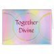 The spiritual affirmation, Together Divine, is shown on a background of circles and spheres of pink, yellow, and blue. Changing the way we think.