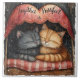 This heartwarming illustration showcases two affectionate cats curled up together, forming a perfect symbol of love and companionship. The ginger tabby and grey feline snuggle close, their eyes closed in peaceful contentment as they embrace each other in a wicker basket. Protecting them from the rain under a delicate red canopy, they snuggle on a warm red-and-white blanket to create a dreamy, romantic setting. With a charming, vintage watercolor style, this artwork beautifully expresses love, warmth, and the unbreakable bond between kindred spirits—making it an ideal piece for cat lovers and those who cherish heartfelt connections. Use as a trivet, backsplash, home decor and more.