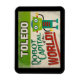 A charming Toledo Ohio vintage travel refrigerator magnet featuring a funny and friendly robot, along with fun retro style text that says, "See you in Toledo"