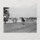 Tom Mix leans down from the saddle at a full gallop to pick up another man's hat from the ground.