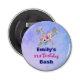 A cool boho themed birthday favour bottle opener for a 21st birthday bash. A native american themed watercolor design. A tomahawk and hatchet crossed together, at their centre a bouquet of feathers and pretty pink and yellow flowers. The background is a soft purple blue watercolor texture. A cool native american themed design with a boho hippy flair.