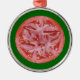 Photograph of red tomato slice on green background. An unusual ornament that may be perfect for tomato growers, chefs, or people who just like tomatoes.