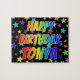 This vibrant, exciting, birthday-themed jigsaw puzzle design has the message "HAPPY BIRTHDAY, TONYA" with the characters having a colourful rainbow spectrum inspired gradient pattern, along with a lively star shapes background pattern. A vibrant puzzle like this might be used to send a birthday greeting message to somebody named Tonya. [~Z0000468]