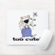 A white with brown stripes kitty cat holding a lilac flower and text that reads "Too Cute!" on cat T-shirts, mugs, buttons, bags, and more.