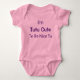 Funny, cute pink one-piece for a newborn baby girl with the custom words "I'm tutu cute to be nice tu" (© Mira) in trendy, stylish fonts.