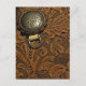 Customise the country and western theme Tooled Leather Saddle Blank Postcard with your own personal message to your cowboy or cowgirl. This charming custom ranch theme card features a digitally enhanced farm photograph of a brown horse saddle with an intricate tooled leather floral and leaf design.