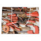 A collection of old antique red handled tools on a table at a flea market.